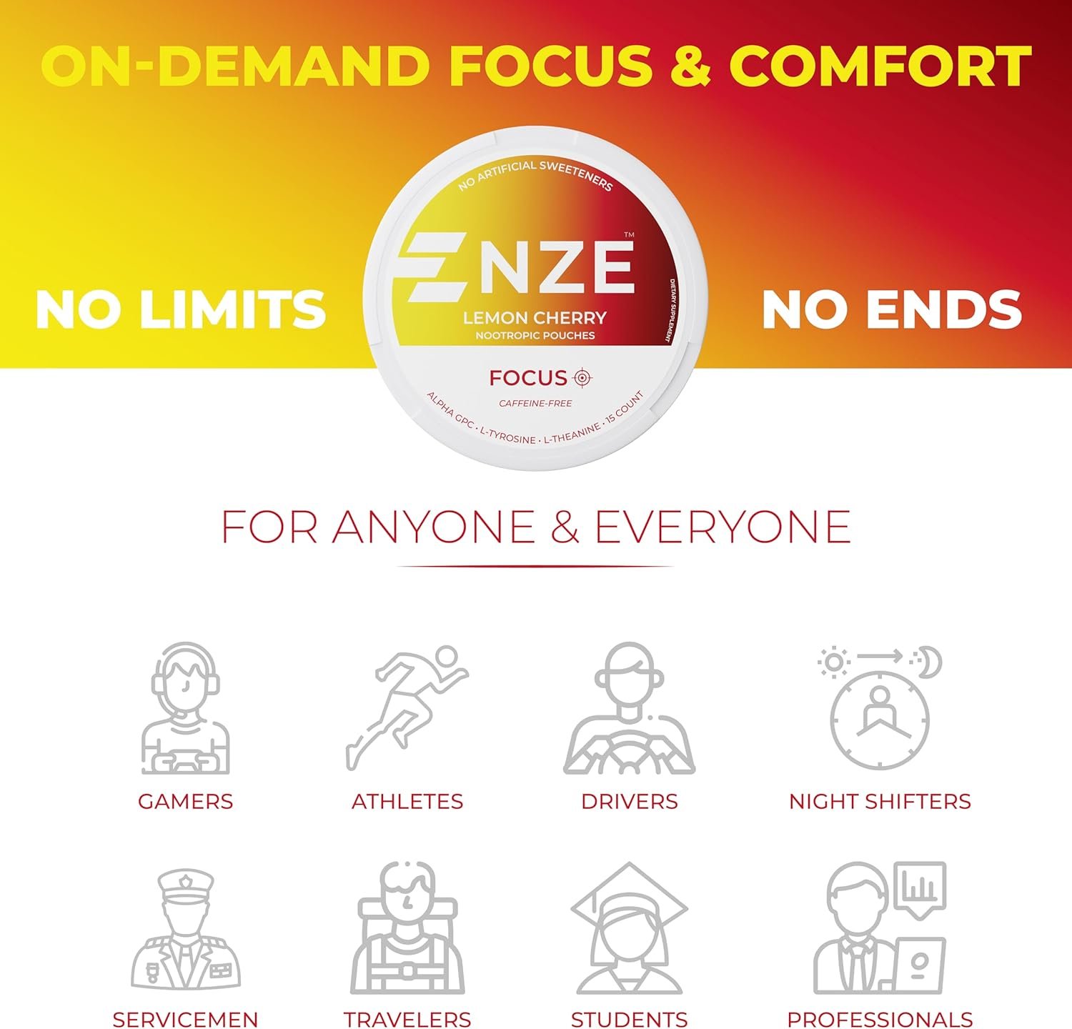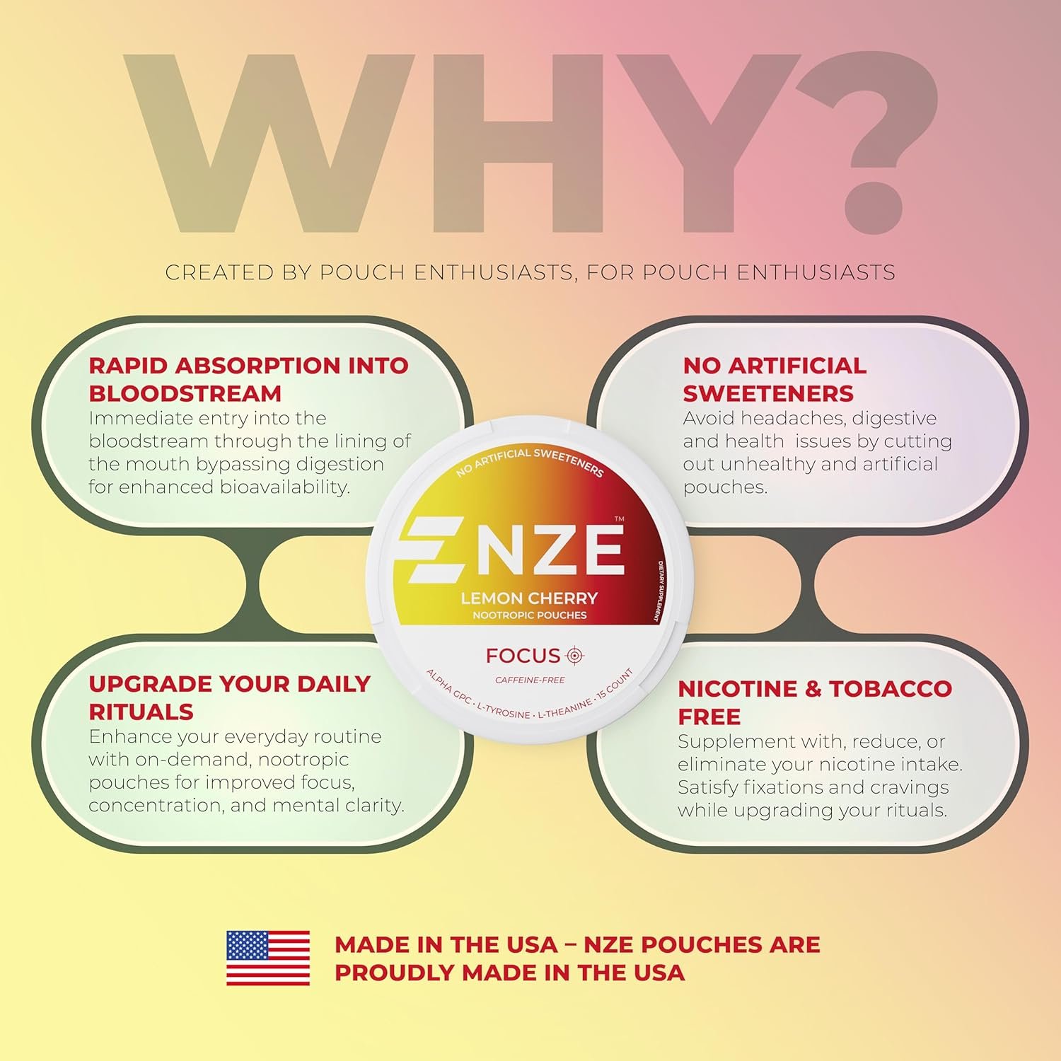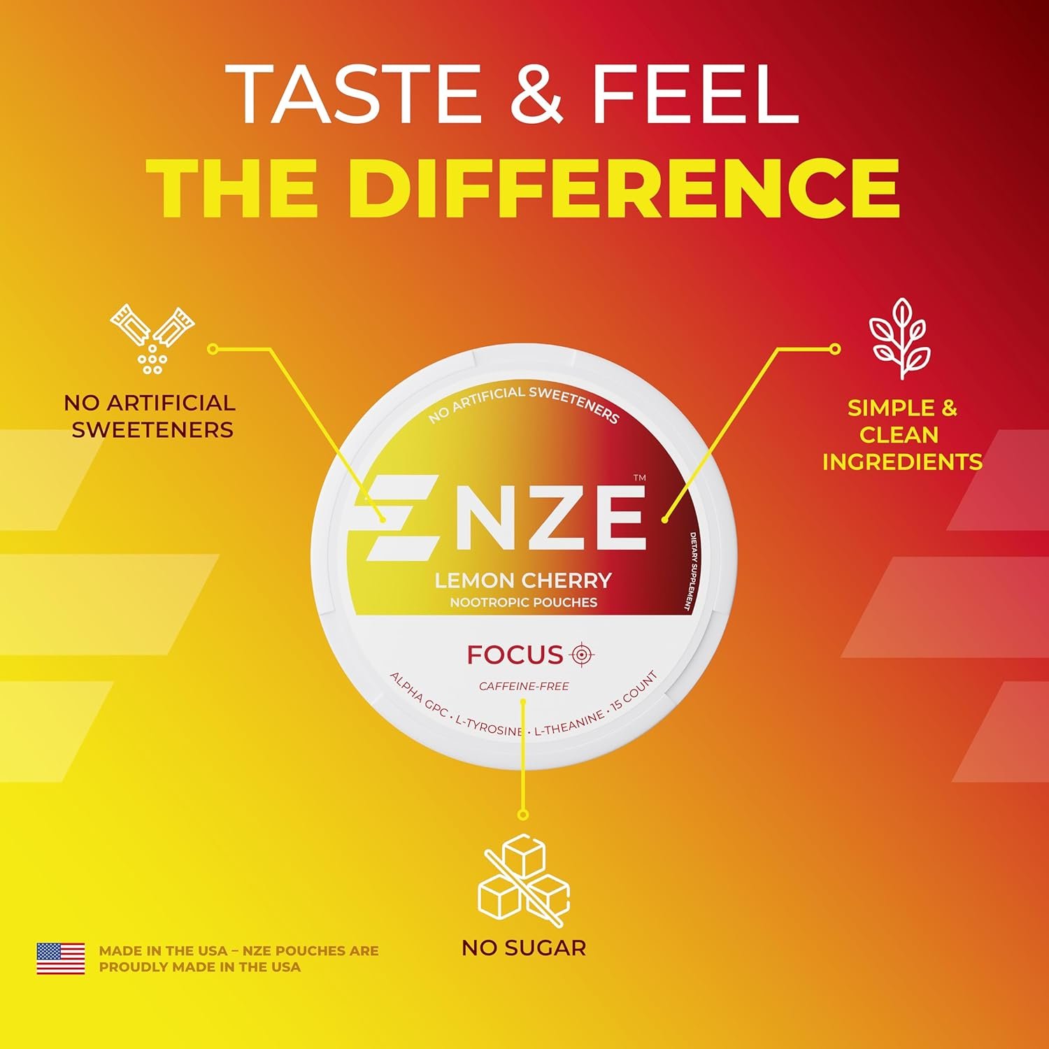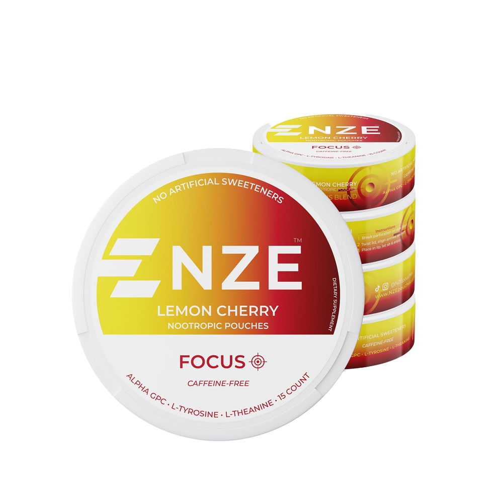- Boost Focus – NZE Focus pouches are Caffeine-Free and are enhanced with Premium Nootropics consisting of 50mg L-Theanine, 50mg Alpha GPC and 50mg L-Tyrosine to keep you operating at peak mental performance.